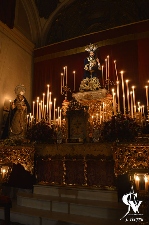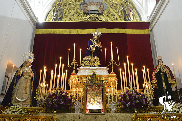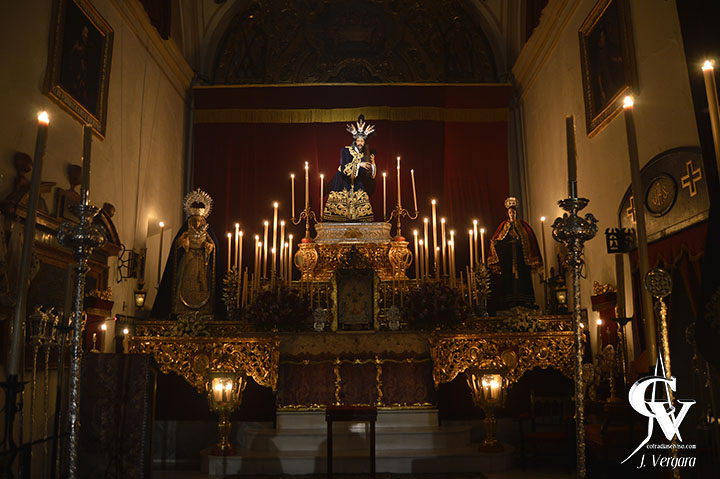 Para la ocasión, la priostía ha preparado un altar elegante en el que, como es habitual, los respiraderos del que fuera el antiguo paso procesional del Señor forman gradas sobre las que se dispone la candelería y varias jarras exornadas con rosas violáceas, claveles rojos y morados y azucenas blancas, entre otras flores. Completan el conjunto dos mesas de credencias con sendas bandejas de plata, relicario de la Beata Mariana de Jesús, la custodia usada para exponer el Santísimo y otros ornamentos.