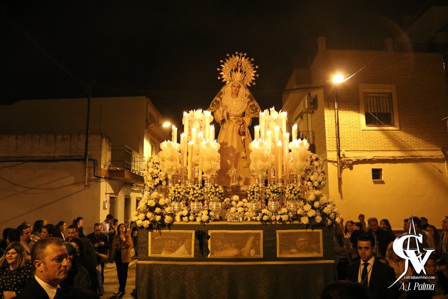 En torno a las 23:00 horas de la noche la Señora cruzaba el dintel de la Casa-Hermandad de Santa María del Alcor, poniendo el punto y final a una salida procesional en la que se vivieron momentos muy emotivos a su paso por la Residencia de Mayores «San Pedro Nolasco» y la Capilla «María Santísima de la Esperanza», donde aguardaba la imagen del Señor de la Redención, así como su discurrir por el Barrio, donde un tambor destemplado recordó la ausencia del citado costalero de la Stma. Virgen.