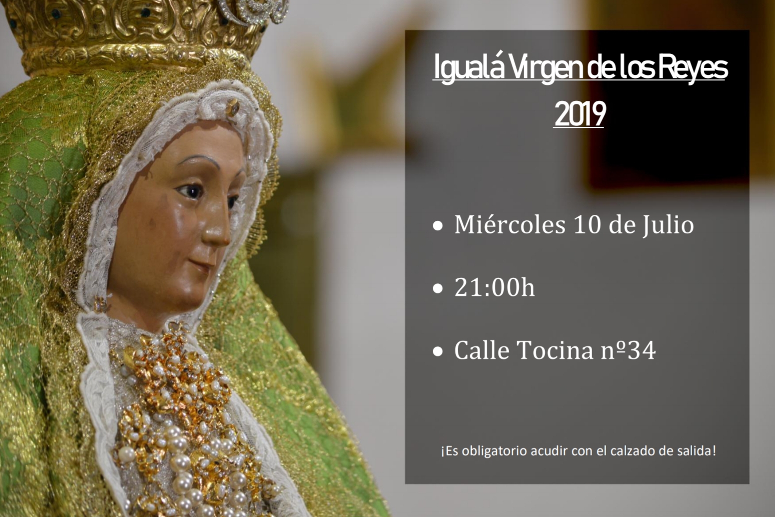 Así, esta primera igualá de costaleros para el paso de la Virgen de los Reyes tendrá lugar el próximo miércoles 10 de julio, a las 21:00 horas en la calle Tocina, nº 34.
