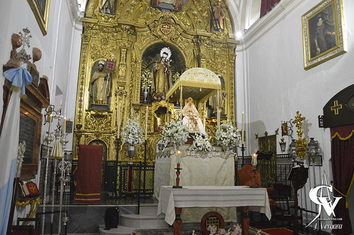 Durante estos días la Virgen de los Reyes presidía el presbiterio del Convento en su paso de palio de tumbilla, que este año presentaba novedades aparte de la sustitución de la parihuela, como el estreno de los bordados del techo o de piezas de orfebrería como jarras o maniguetas. El retablo mayor de la iglesia conventual hacía de telón de fondo para un altar exornado con una variedad de flores blancas, principalmente azucenas, margaritas y gladiolos. En sus laterales se completó el conjunto con faroles y cruz alzada, cruz parroquial con ciriales, bandera corporativa, simpecado y otras insignias.
