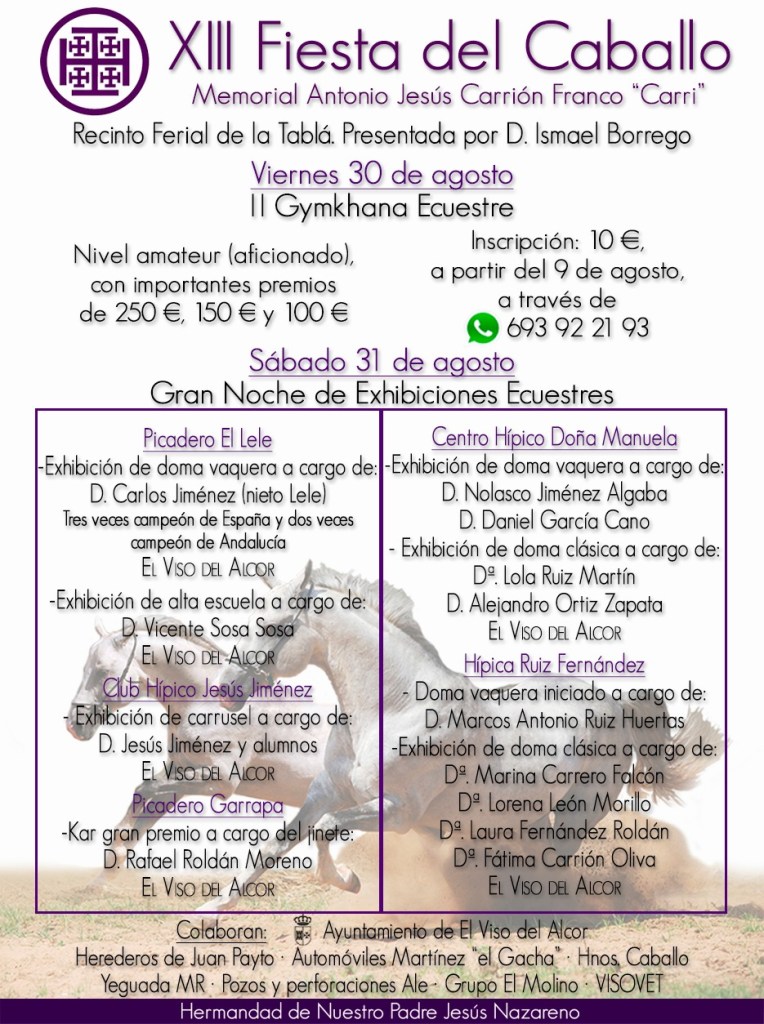 La Hermandad de Nuestro Padre Jesús Nazareno organiza los días 30 y 31 de agosto la Fiesta del Caballo, que este año alcanza su XIII edición. Este evento anual se celebrará por la noche en el Recinto Ferial de la Tablada, como de costumbre, y será presentado por D. Ismael Borrego.
