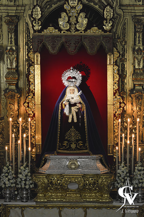Durante el triduo, donde predicó el padre D. Daniel Mariño Barragán, y la función, presidida por el vicario parroquial D. José Iván Martín Pascual, la Santísima Virgen estuvo ubicada en el retablo mayor de la Iglesia Conventual del Corpus Christi, bajo un nuevo dosel que se estrenaba estos cultos, realizado con partes del que ya existía. Iluminado por algunos candelabros, que aportan junto con el dosel verticalidad y simetría al conjunto, y exornado con sendas jarras de rosas y alhelíes blancos, este altar continúa el estilo sobrio y elegante que tenía el año pasado.