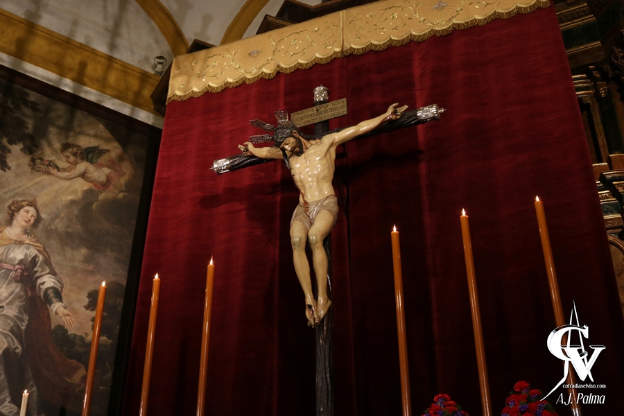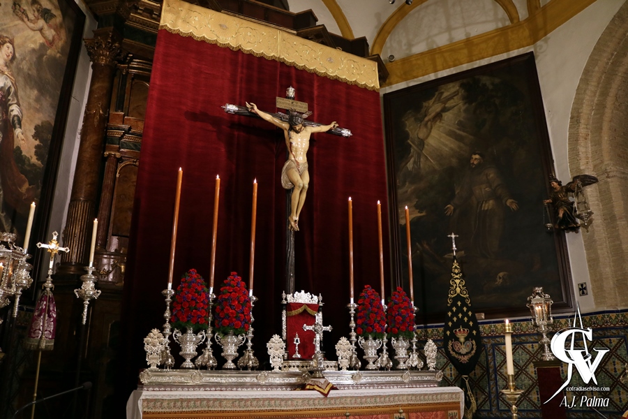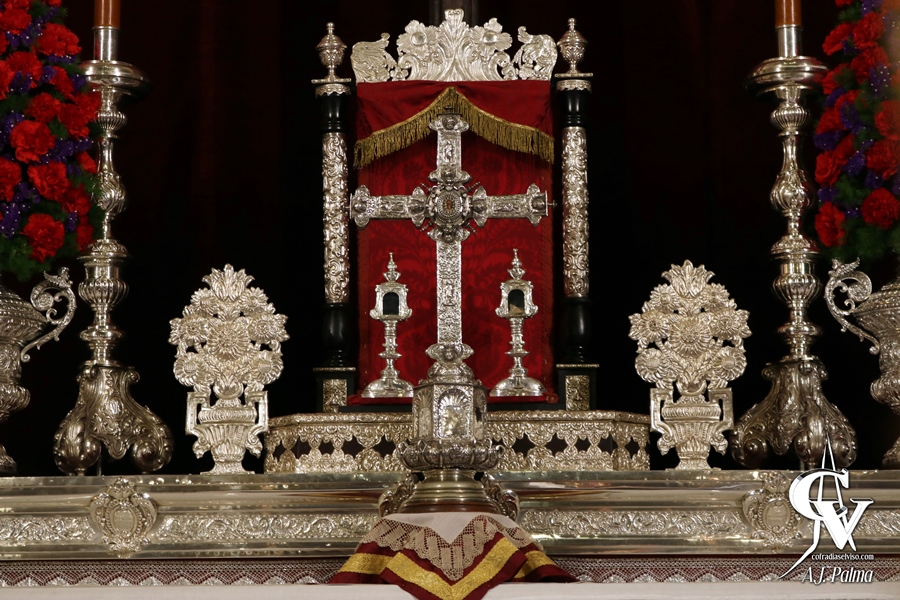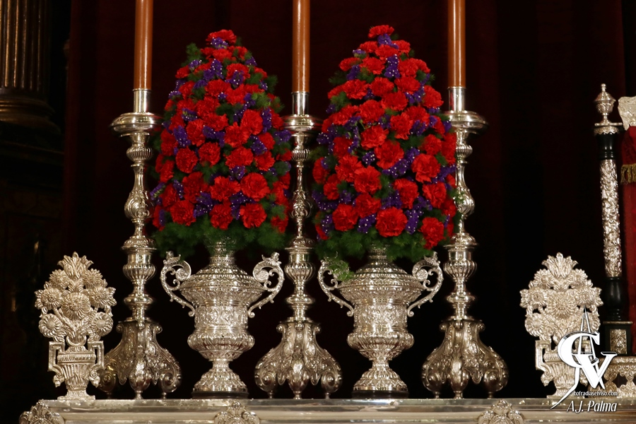 En este año 2020, la Hermandad ha seguido la línea en la que viene trabajando en los últimos años con respecto al altar de este Sagrado Titular, con un altar en el que destaca la platería con los 6 candelabros del paso de palio con cera color tinieblas, mariposeros, el baquetón de plata del paso de la Custodia de Su Divina Majestad, faroles y jarras de flores, donde destacan principalmente claveles en color rojo.