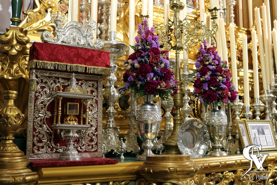Flanqueando el altar se encuentran el estandarte corporativo y uno de los estrenos que tendrá este año la cofradía en la tarde-noche del Jueves Santo, la bandera de la Sangre de Cristo, que abrirá uno de los tramos de nazarenos del Señor. Por su parte, la Virgen del Rosario, ya ataviada de hebrea, se encuentra en la hornacina que ocupa habitualmente la imagen de Santa Ángela de la Cruz, enfrente al altar mayor.