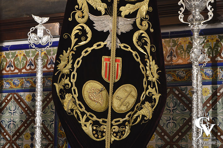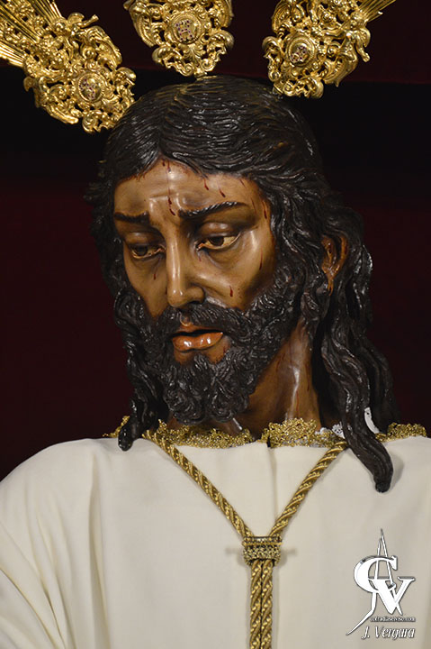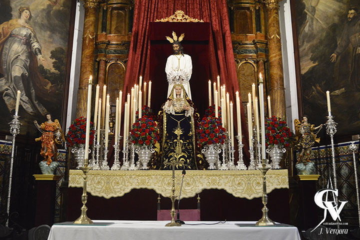 Exornado con jarras de claveles rojos y statices morados e iluminado con una candelería simétrica y algo abundante de cera blanca, un fondo rojo que no oculta el retablo mayor contrasta con el blanco de la túnica del Señor Cautivo. Dos arcángeles con incensarios, los mismos del paso del Señor, la Cruz Parroquial y el estandarte corporativo, todo ello ubicado en los laterales, completan el conjunto.