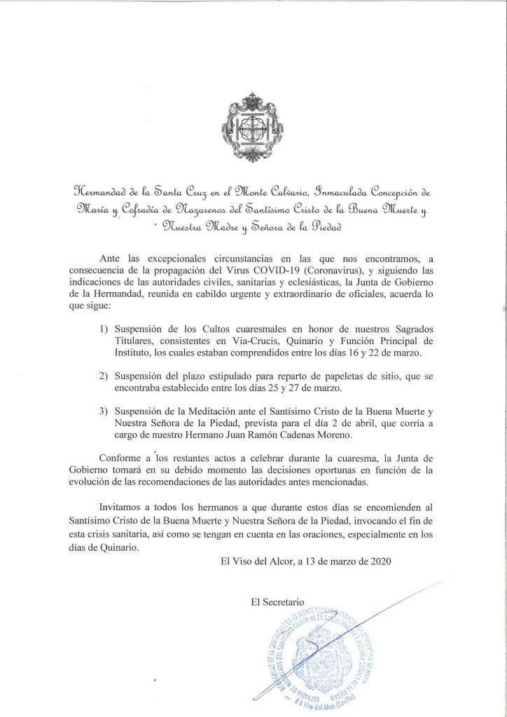 Además de ésto, se ha suspendido el reparto de papeletas de sitio, que tendría lugar la siguiente semana, además de la Meditación ante el Santísimo Cristo de la Buena Muerte y Nuestra Señora de la Piedad, prevista para el 2 de abril y que corría a cargo de Juan Ramón Cadenas Moreno, Diputado de Cultos y Formación de dicha Hermandad.