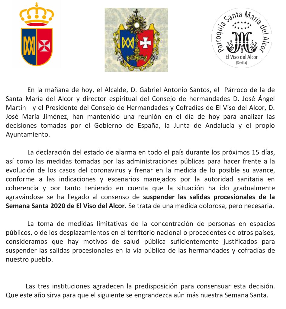 Después de todas estas suspensiones que hemos ido viviendo en las últimas horas, y tras una reunión entre D. Gabriel Antonio Santos, Alcalde de El Viso del Alcor, Rvdo. P. D. José Ángel Martín, Párroco de la de Santa María del Alcor, y D. José María Jiménez, Presidente del Consejo General de Hermandades y Cofradías, se ha tomado la decisión de suspender las salidas procesionales de la Semana Santa de 2020 en nuestra localidad.