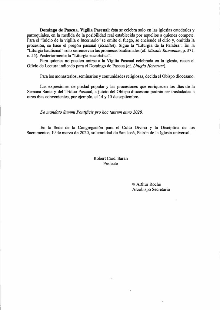 En este decreto se habla sobre cómo celebrar los Santos Oficios para acercar a los fieles a este Triduo Pascual con la situación en la que nos encontramos a día de hoy debido a la pandemia del coronavirus. Firmado por el Cardenal Robert Sarah, se sugiere pasar las procesiones de los días de Semana Santa a otros días convenientes. El decreto está en varios idiomas, siendo el castellano uno de ellos, y dice así: