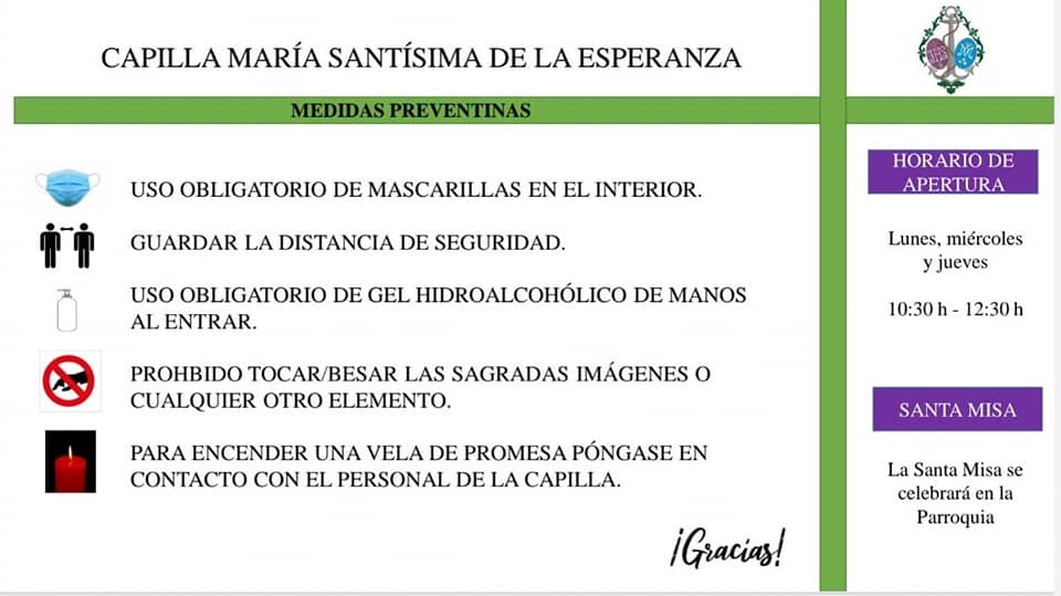 Esta nueva fase, entre otras cuestiones, permite una mayor afluencia de fieles a los templos. Debido a esta medida, y tras más de dos meses de cierre, la Capilla María Santísima de la Esperanza, sede canónica de la Hermandad de la Esperanza, volverá a abrir sus puertas al culto, con un horario limitado, siendo esta apertura los lunes, miércoles y jueves de 10:30 a 12:30 horas, abriendo por primera vez desde este lunes día 25.