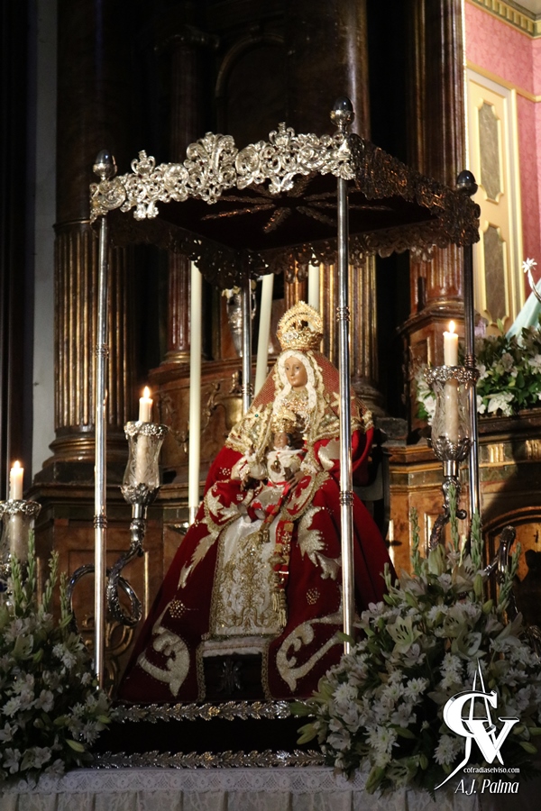 Para ello, la Asociación montó un sencillo altar el cual presidía la Santísima Virgen, ataviada con manto rojo, saya blanca y toca de sobremanto bordados. La Virgen de los Reyes se encontraba en un templete realizado con piezas de orfebrería y con los varales de la tumbilla en la que procesiona cada año, a excepción de éste, tras la suspensión del besamanos, la procesión y la peregrinación a Sevilla a ver a la Patrona de la Archidiócesis, la Virgen de los Reyes, al amanecer del 15 de agosto.