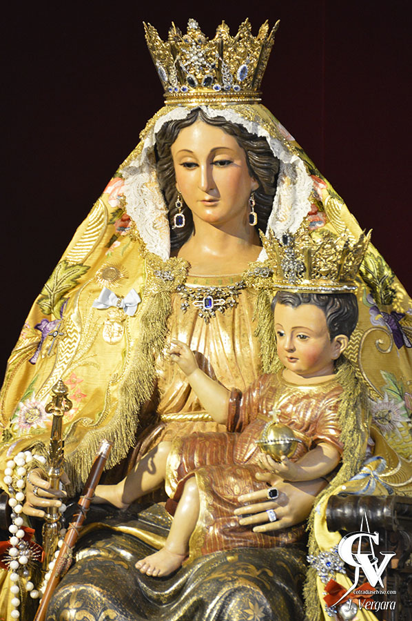 Para la novena, Santa María del Alcor pasó de la peana marmoleada a la peana de madera dorada con pan de oro que adquirió la corporación hace un par de años. Para los primeros días de novena, la Santísima Virgen portó el manto dorado que donó Antonio Becerra, mientras que para la segunda mitad de la novena portó el manto blanco bordado en sedas. Además, la Virgen y el Niño portaban las coronas de salida antiguas, embellecidas con distintas joyas.