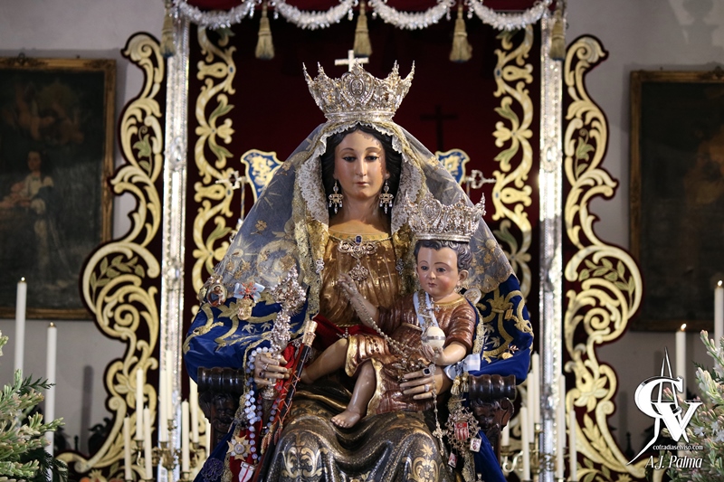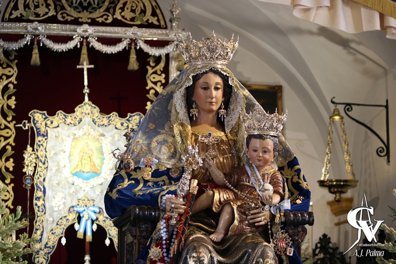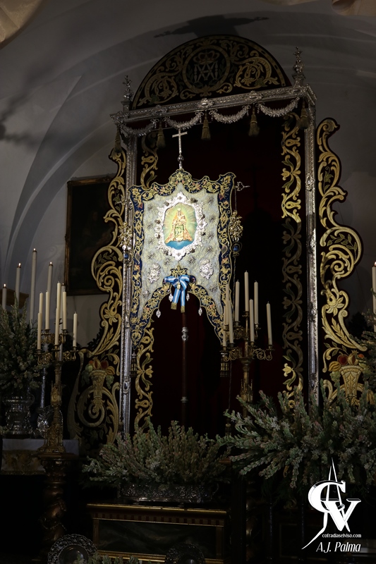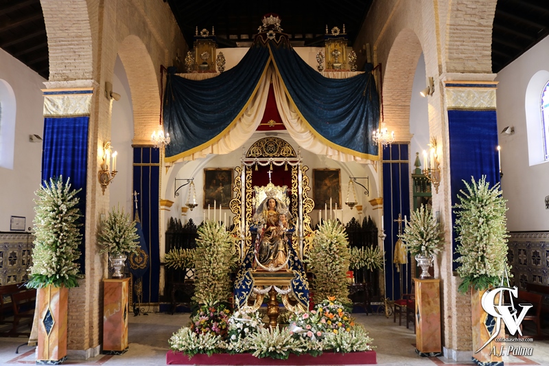 Para esta veneración, la Santísima Virgen fue adelantada con respecto al altar, ubicada sobre la peana de madera dorada y ataviada con con el manto de la Coronación, las coronas de la Coronación, toca de sobremanto y diversas joyas. Mientras tanto, el altar de cultos era presidido por el Simpecado, que de manera excepcional ha estado durante todos los Cultos a un lado del altar, manteniendo el altar la estructura de los días de Novena.