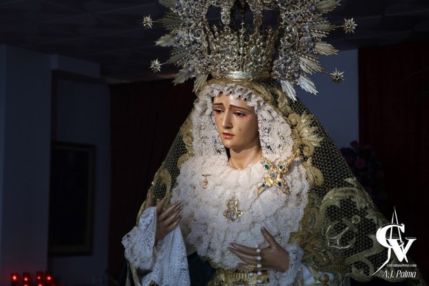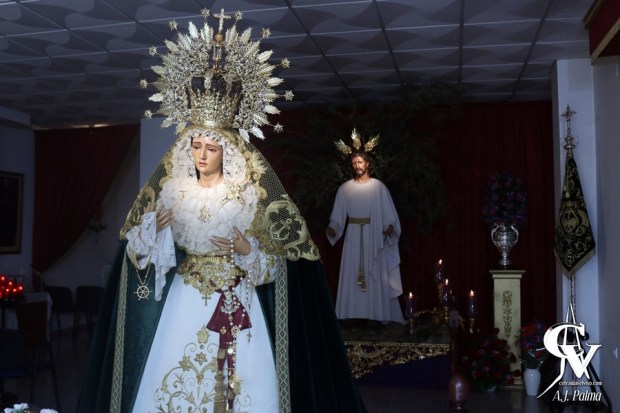 En primer término, se encontraba María Santísima de la Esperanza, ataviada con su ropa de salida, como son la saya blanca bordada en oro, toca de sobremanto bordada y corona y manto de salida. La Santísima Virgen podía ser contemplada desde todos los ángulos, al encontrarse en una posición adelantada en la Capilla, cercana a la entrada. De esta forma, la Virgen de la Esperanza podía ser rodeada, para poder acercarse también a su Divino Hijo. Además, a los pies de la Santísima Virgen se encontraba la reliquia de San Manuel González que custodia la Hermandad desde hace varios años.