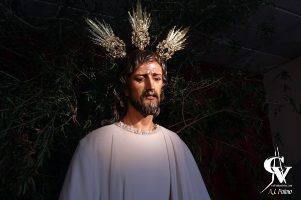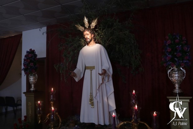 El Señor se encontraba flanqueado por candelabros de guardabrisa que aportaban luz a esta veneración. A su vez, el altar mayor estaba flanqueado por pedestales de madera dorada con jarras de orfebrería pertenecientes al paso de María Santísima de la Esperanza con rosas de color rosa, lirios y distintos verdes.