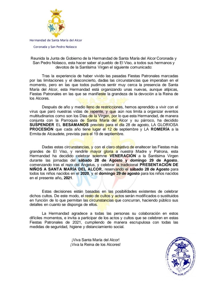 En la noche del miércoles 18 de agosto, la Hermandad de Santa María del Alcor Coronada sacó un comunicado en el cual se detallaban las distintas decisiones que se habían tomado respecto a los cultos en honor a su Sagrada Titular, Santa María del Alcor, durante las Fiestas Patronales de este año 2021.