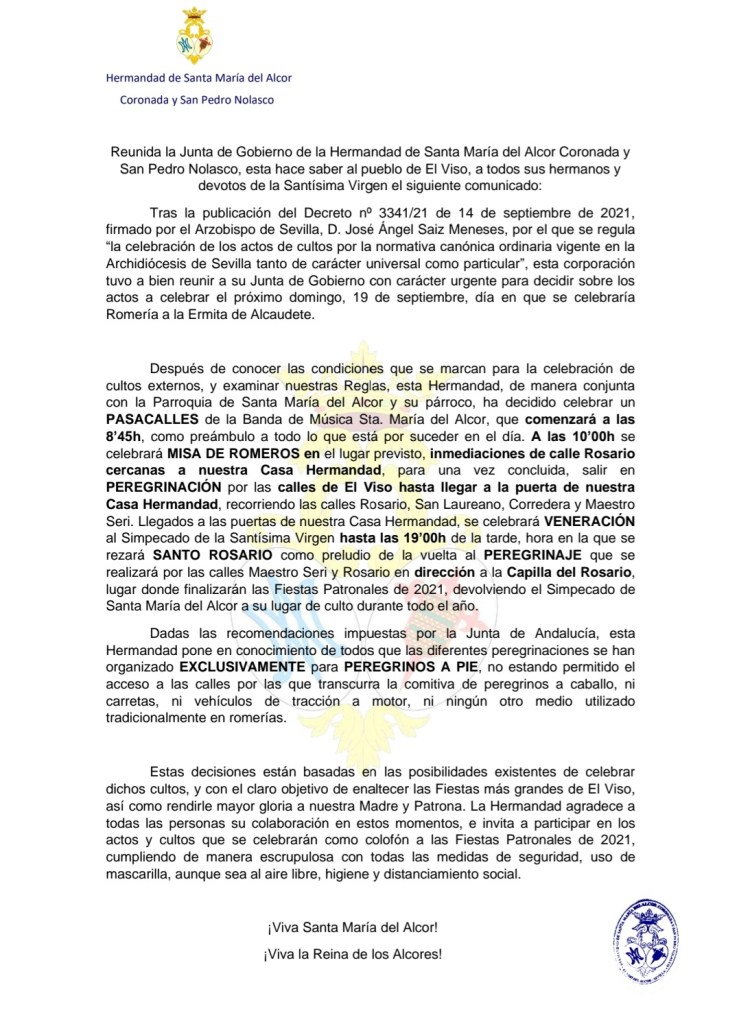 En el mes de agosto, la Hermandad de Santa María del Alcor emitía un comunicado en el que se informaba de la forma en que se celebrarían todos los cultos y actos de las Fiestas Patronales. Sin embargo, en la mañana del 16 de septiembre, tras una reunión de carácter urgente de la Junta de Gobierno, se han acordado hacer cambios en los actos a celebrar el próximo domingo 19 de septiembre, día en el que se celebraría la tradicional Romería a la Ermita de Alcaudete.