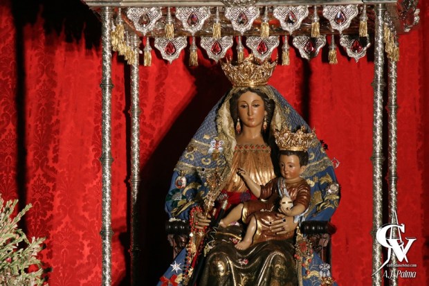 El altar para ambos días fue similar, con la Santísima Virgen entronizada bajo el templete de su paso procesional, ataviada con el manto de los castillos y leones y las coronas de la Coronación Canónica, además de distintos broches y joyas. De fondo, un dosel de damasco rojo enmarcaba el altar, dejando ver parte de la cruz que preside esta plaza, estando el dosel rematado por un damasco beige con borlones y piezas de orfebrería.