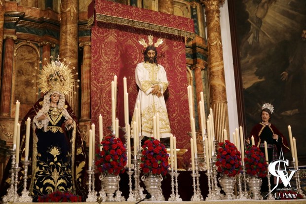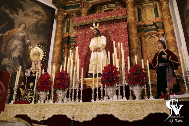 Este altar sirvió también para la Solemne Función Principal de Instituto que celebró la Hermandad el sábado 12 de marzo, finalizando los Solemnes Cultos con la veneración de los Sagrados Titulares el día siguiente, para la que se montó un nuevo altar efímero.
