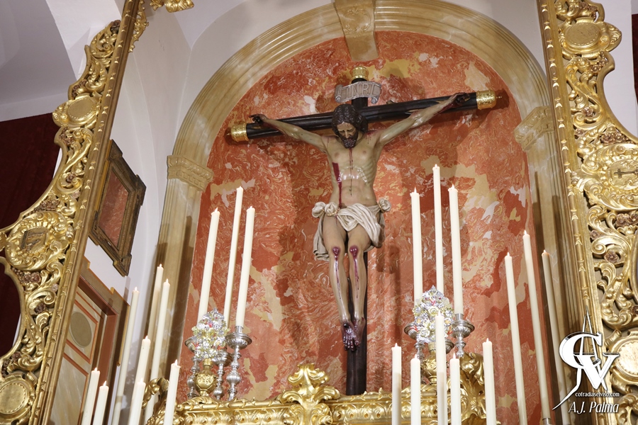 Con esta distribución, este altar gana en elegancia gracias a la verticalidad de su montaje. Dicho altar se mantuvo montado tanto para este Triduo como para la Solemne Función que se celebró el domingo 26 de febrero en honor de este crucificado que tallara D. José Navía Campos.