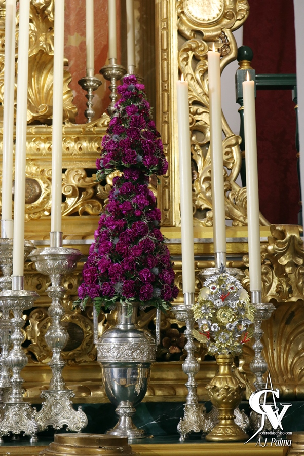 Sobre las gradas del altar, tanto las efímeras como las permanentes, se han colocado puntos de luz de cera crema de forma simétrica, utilizando piezas de la candelería del paso de palio de la Hermandad. De forma simétrica se encuentran también en este altar seis jarras de flores de talco, distribuidas en distintos lugares del altar, teniendo también dos jarras con ramos de flores compuestos por claveles de color malva con algo de verde. Todas estas jarras se encuentran distribuidas de forma simétrica.