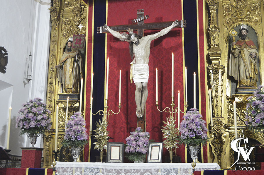 Durante la pasada semana, el Señor de la Misericordia volvió a estar bajo su característico dosel, rodeado de cuatro candelabros con tres puntos de luz cada uno y cuatro jarras de grandes flores moradas, además de las flores de talco que habitualmente decoran su retablo.