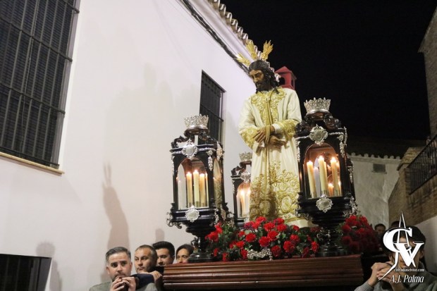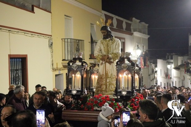 El Señor portaba la túnica de tisú blanca bordada en oro que estrenó en 2021, entronizado en unas andas iluminadas por cuatro faroles cedidos por la Hermandad de la Piedad de El Viso del Alcor. Por su parte, el exorno floral estaba compuesto de ramos de claveles rojos con salpicado de flores violetas y algo de verde.