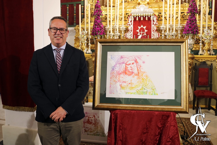 Para la ocasión, este trabajo ha sido realizado por D. José Manuel Peña Jiménez, artista natural de Mairena del Alcor que ya ha realizado previamente distintas obras para la corporación del Jueves Santo. Su obra es un retrato de María Santísima del Rosario, titular de la Hermandad, realizado con una explosión de color sobre un fondo blanco utilizando la técnica de acuarela sobre papel, con unas dimensiones de 70×50. El estilo de esta obra la hace, sin duda, única entre las otras realizadas para la Hermandad.