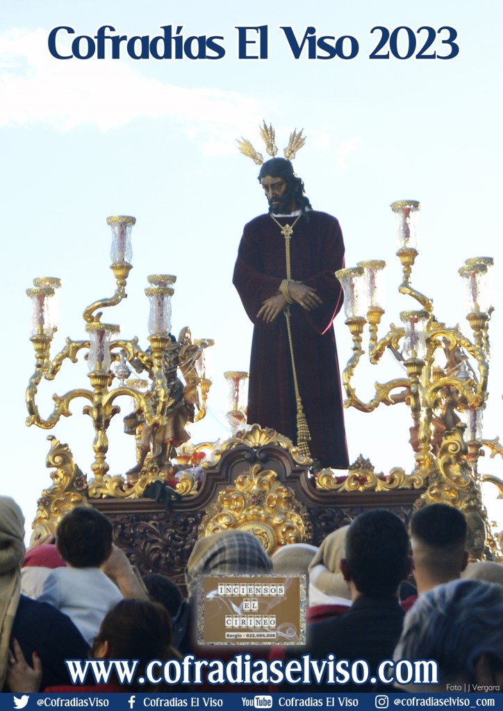 En la parte superior se puede leer en letras azules “Cofradías El Viso 2023” y en la parte inferior recoge la dirección web del portal cofrade y las redes sociales en una franja azul. Además, este cartel cuenta con la publicidad de Inciensos El Cirineo.
