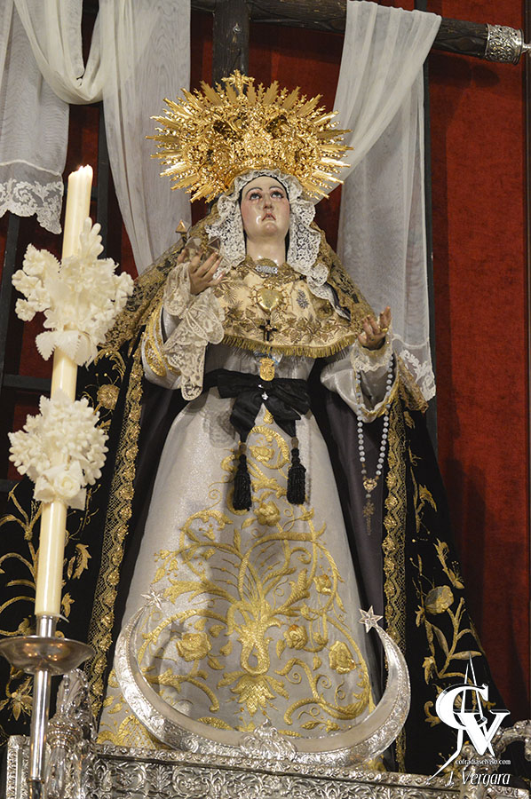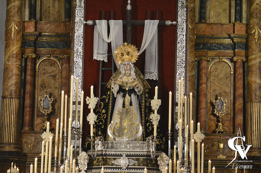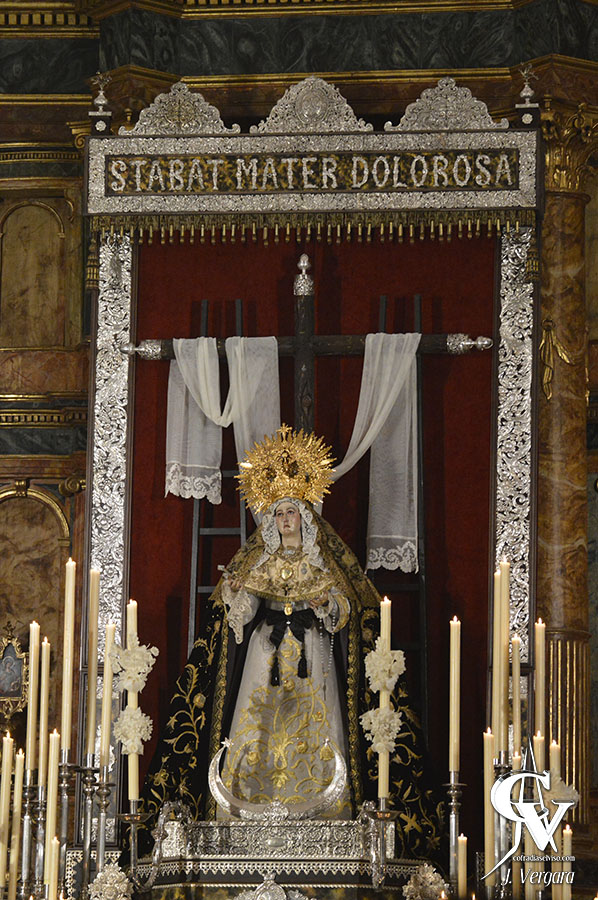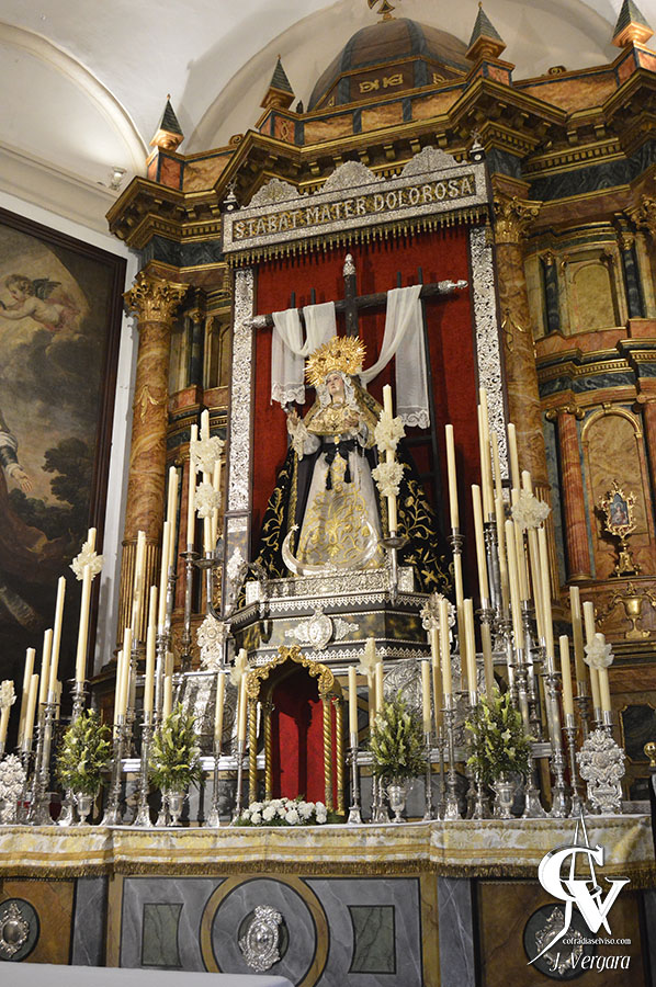 Como todos los años, el altar está encabezado por su característico dosel con la inscripción latina «Stabat Mater Dolorosa». A los pies del altar, a modo de manifestador, destaca en el centro el templete donde el Santo Lignum Crucis procesionaba en el Corpus antes de ser sustituido por la Inmaculada Concepción, que ha sido usado durante estos cultos para la Exposición del Santísimo.