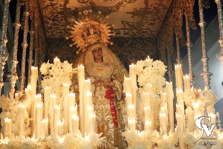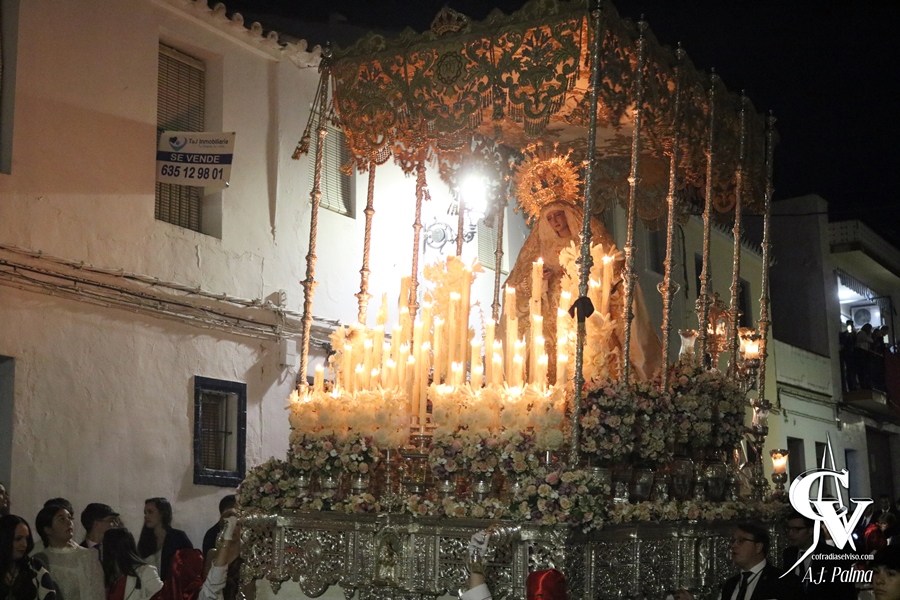 Las puertas de este templo, sede canónica de la Hermandad, se abrieron aproximadamente a las 19:00 horas, dando lugar a uno de los momentos más destacados y esperados de esta jornada. Al salir María Santísima del Rosario, la Banda de Música Santa María del Alcor interpretó la marcha «Madre Rosario», compuesta por D. Ricardo J. Quirós López. Esta marcha, de corte alegre, se une a un repertorio propio de la cofradía cada vez más extenso, especialmente en composiciones para bandas de música.