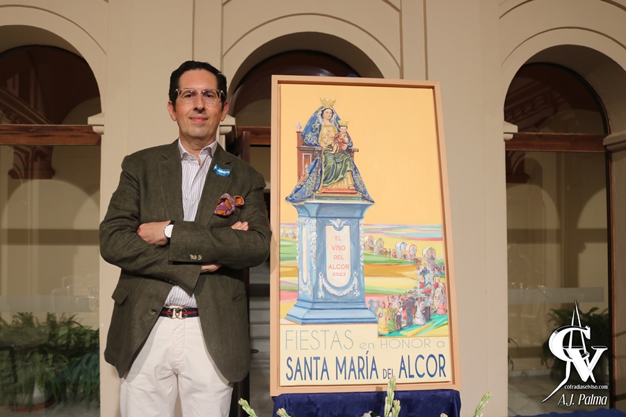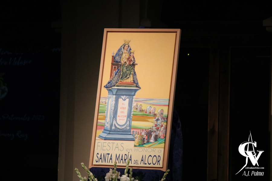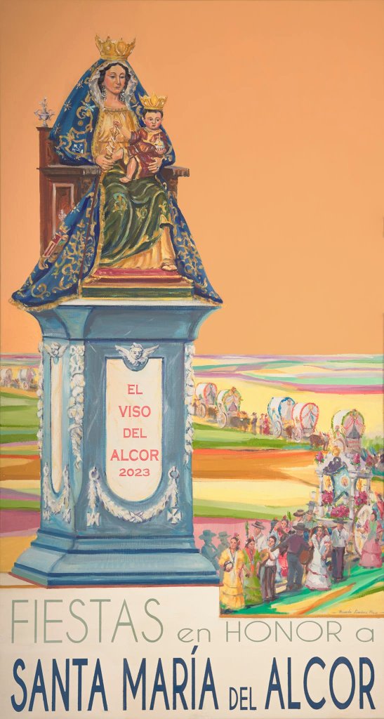 La técnica usada para la elaboración de esta obra es la de óleo sobre lienzo, contando con una gran verticalidad, teniendo en la parte inferior una banderola con la leyenda que anuncia las Fiestas con una tipografía muy limpia. Como el mismo autor comentó, el cartel quiere dejar constancia de un hecho que pasará a la historia de El Viso del Alcor en este año 2023: la bendición del monumento a Santa María del Alcor, que se encontrará ubicado en la plaza localizada en el cruce de las calles Corredera, Rosario y Manuel Jiménez León. Por ello, se ha tomado la licencia de modificar el contenido de las cartelas del monumento, para incluir la leyenda «EL VISO DEL ALCOR 2023». Igualmente, para marcar otro año importante en la historia de la localidad, Santa María del Alcor aparece ataviada como en la primera fotografía que se realizó con los atributos de la Coronación Canónica, estando inspirada en la estampita que se repartió en aquel Pontifical, como referencia al año 2005. Como fondo, un cielo anaranjado representa el calor en las tardes del mes de septiembre, con la Vega en un segundo término, por la que transita la comitiva de la tradicional Romería de Santa María del Alcor, con la carreta cobijando el Simpecado de la Virgen y numerosas carretas acompañando. Además, anteceden al Simpecado numerosos peregrinos cantando, en referencia a la frase de San Agustín: «quien canta reza dos veces».