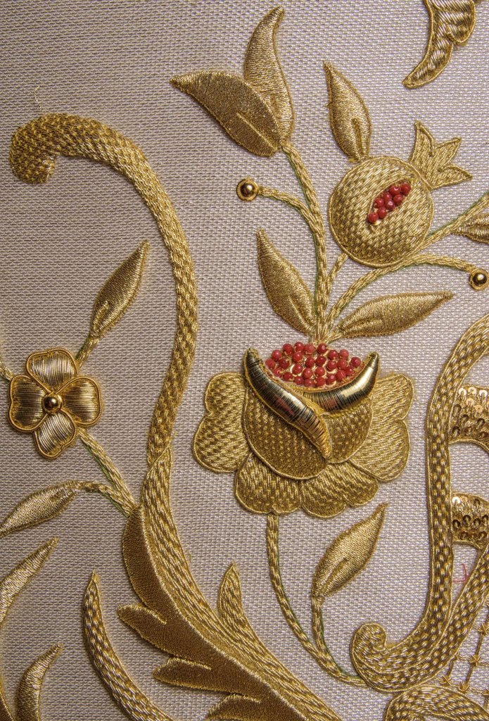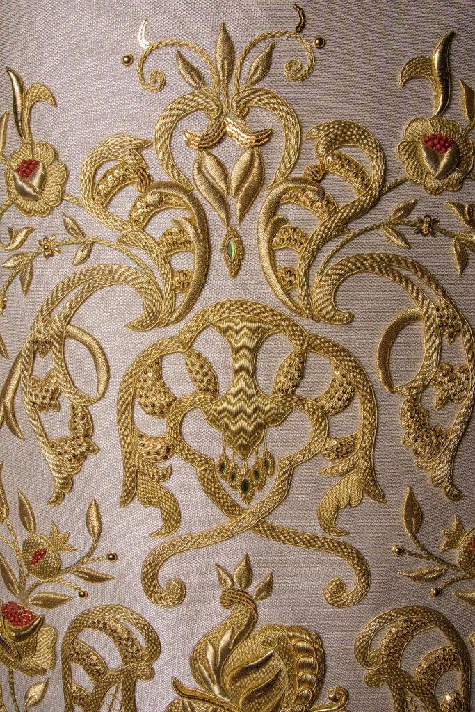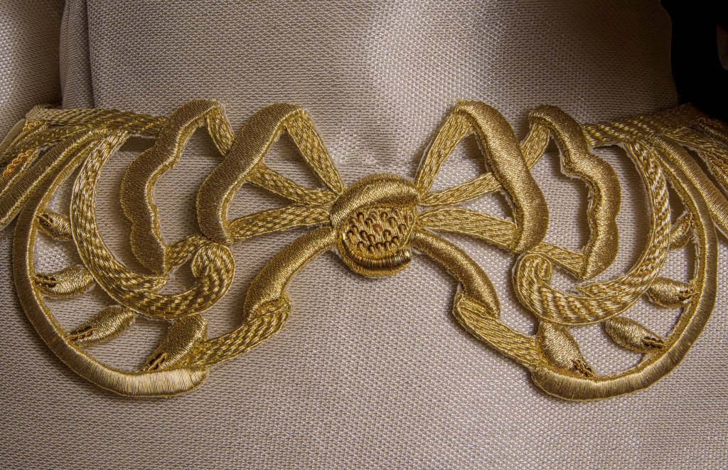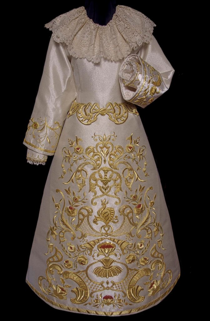 Esta saya está bordada en hilos de oro fino sobre tisú de plata y en la misma se encuentra un amplio abanico de técnicas de bordado, entre las que destacan la cartulina o la hojilla, siguiendo una clara inspiración en las técnicas empleadas durante el s. XVIII, etapa de esplendor del culto al Rosario. Posee además la particularidad de llevar incrustado en algunas de las piezas piedras de coral, así como espejuelos verdes.