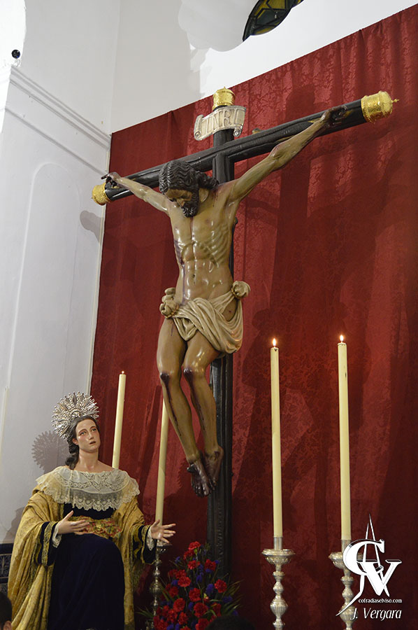 Por su parte, el Santísimo Cristo de la Vera-Cruz se encontraba frente al retablo mayor, en un altar efímero montado por la priostía de la Hermandad en el punto donde se encuentra la hornacina en la que recibe culto a diario Santa Ángela de la Cruz. A sus pies, como ya sucedió en el Vía Crucis del Consejo General de Hermandades y Cofradías de El Viso del Alcor, se situaba la imagen de Santa María Magdalena.