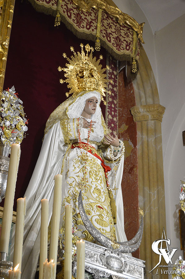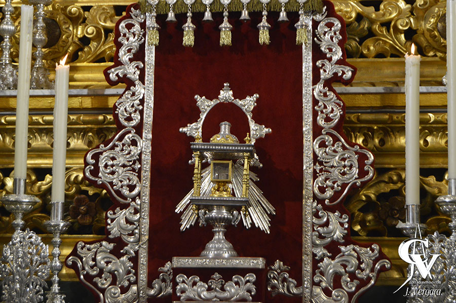 Para esta ocasión, la priostía de la corporación del Jueves Santo montó un altar sencillo, aprovechando la estructura del retablo mayor del templo, que lo presidía en solitario María Santísima del Rosario. Ataviada de igual forma que en el besamanos que tuvo lugar los días previos, la Sagrada Imagen se encontraba colocada sobre una peana de madera marmoleada con apliques de plata, siendo cobijada por el dosel que ya cumplió con esta función en el besamanos. A ambos lados de la Virgen se encontraban unas pilastras marmoleadas, sobre las que estaban colocadas unas jarras con flores de talco.