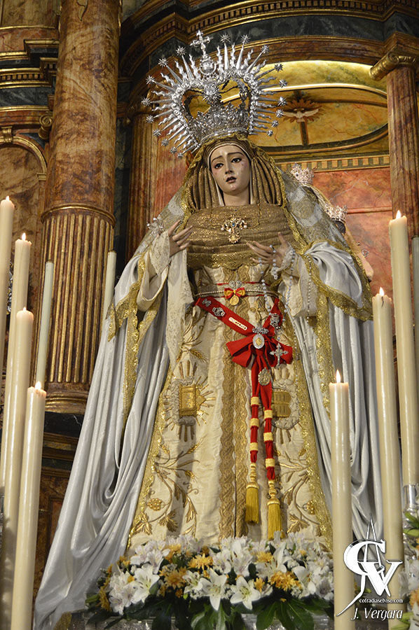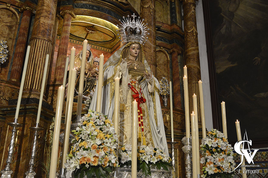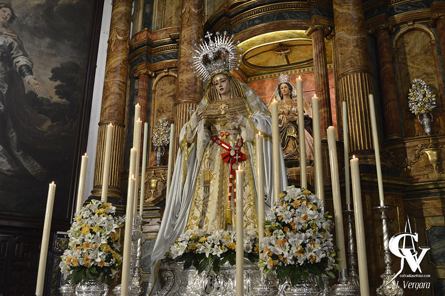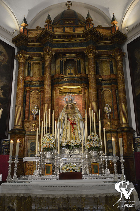 Respecto a los puntos de luz, la cera se distribuía por el altar de forma simétrica, flanqueando a la Santísima Virgen de forma piramidal a ambos lados, utilizando piezas de la candelería del paso de palio. Completaban el altar tres ramos de flores variadas en tonos blancos y amarillos con algo de verde, distribuidos en dos jarras de plata sobre pilastras marmoleadas entre la candelería y a los pies de la Sagrada Imagen, sobre la peana.