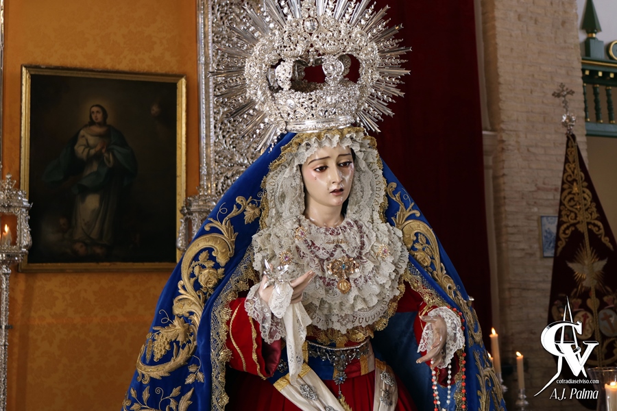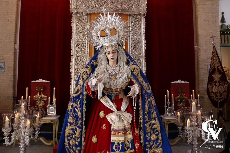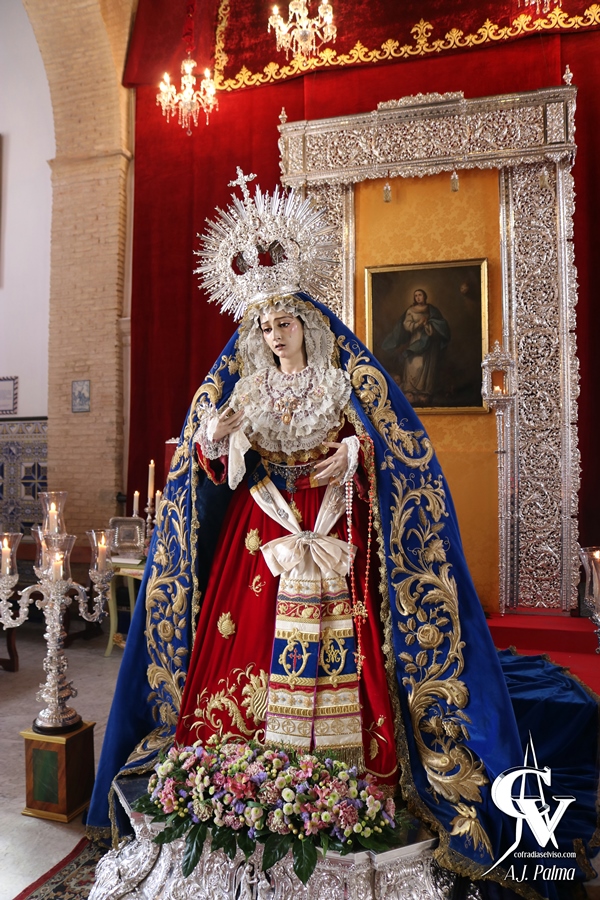 En la parte más adelantada de este montaje se encontraba la Santísima Virgen, que lucía su manto de salida, saya roja bordada y fajín con motivos relacionados con la Hermandad. La Sagrada Imagen estaba sobre su peana del paso de palio, portando multitud de joyas y broches, además de su corona de salida más antigua.
