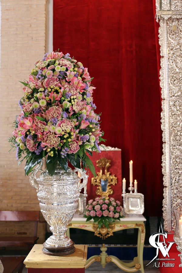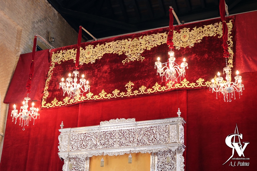 Para ello, la priostía de la corporación del Domingo de Ramos montó un altar efímero en el coro bajo de la Iglesia Parroquial de Santa María del Alcor, donde un gran dosel de terciopelo rojo desplegado desde el coro del templo hacía de fondo. Este dosel, en la parte superior, fue embellecido con la inclusión de un faldón del paso del Señor de la Salud, realizado también en terciopelo rojo con bordados, además de colgar cuatro lámparas de araña, que aportaban una gran iluminación al conjunto.