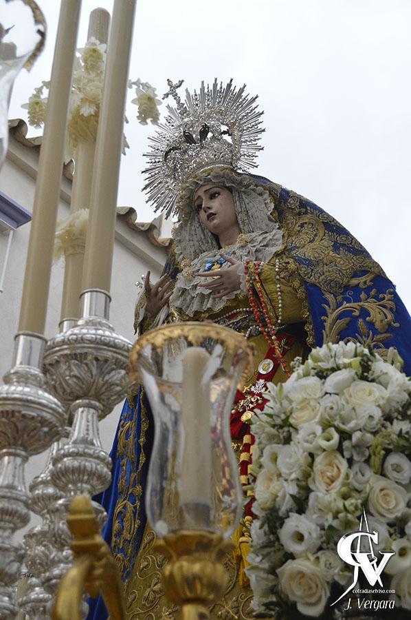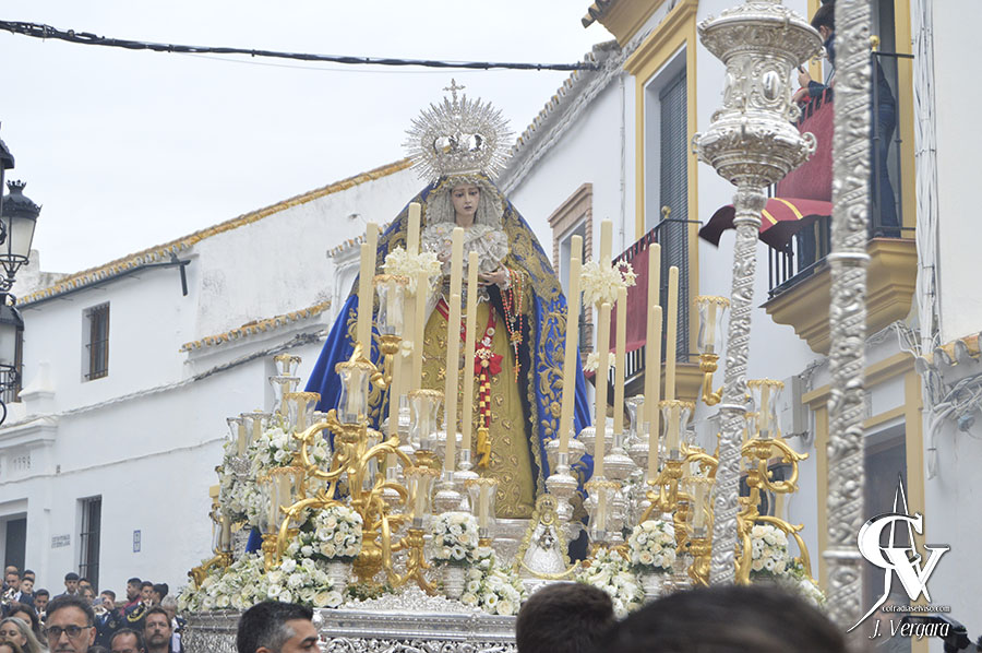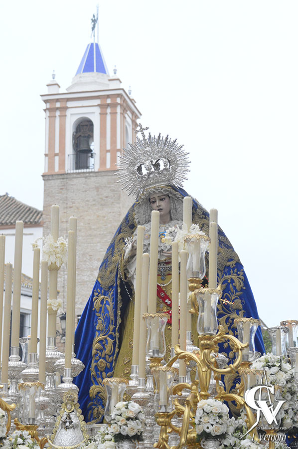 Tras ello, la Virgen de la Paz continuaba con la salida extraordinaria por Convento, donde saludó en el templo mercedario a las corporaciones que allí radican, Plaza del Ayuntamiento y Real, donde se tuvo que tomar una difícil decisión. La mala fortuna quiso que se hicieran presentes una fina pero continua lluvia, además de fuertes rachas de viento, por lo que se decidió en ese punto acortar el recorrido y refugiarse en la Capilla del Rosario, tomando para ello por Calle Colón, por donde transita cada año la cofradía, llegando rápidamente a dicho templo. Este infortunio impidió que la Santísima Virgen volviera a la Barriada que lleva su nombre, y que se vivieran muchos momentos emotivos y para la historia.