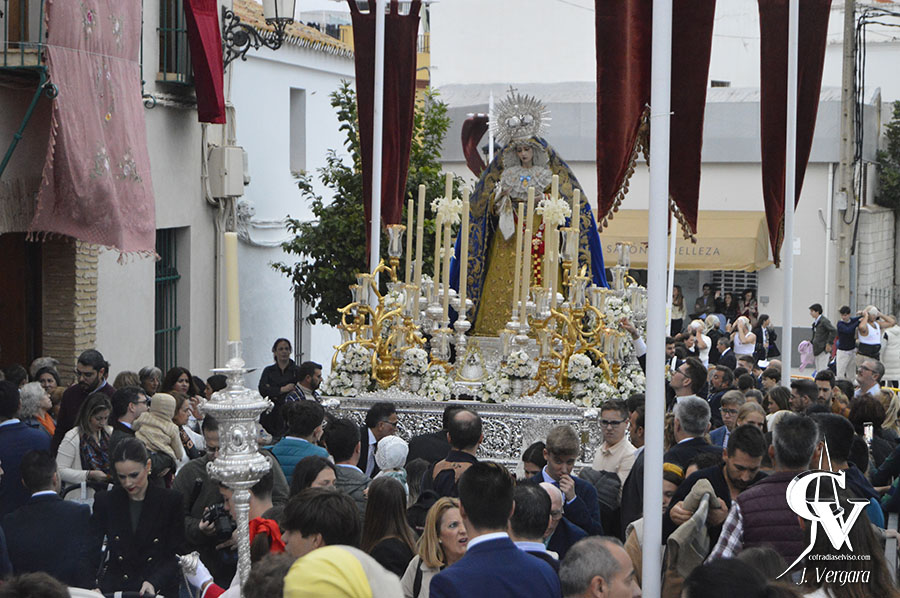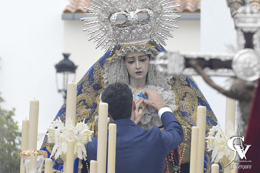 Tras transitar por Manuel Roldán «El Campanero», Amargura, Albaicín y Conde de Castellar, la Santísima Virgen llegaba a la puerta del Ayuntamiento a los sones de la marcha «Hijas de la Paz» de D. Nicasio de los Santos (Q.E.P.D.), donde tendría lugar este importante acontecimiento. Por ello, sobre las 18:00 horas, el Alcalde de El Viso del Alcor hacía entrega de la Medalla de Oro de la Villa, que colocó correctamente un prioste de la Hermandad, en un sencillo acto en el que la arquitectura propia del lugar sirvió de escenario con palcos para vivir este momento.