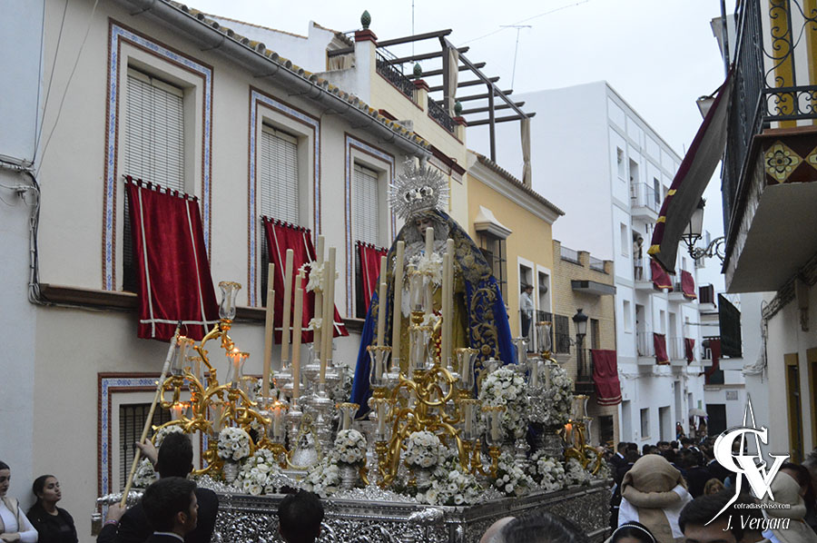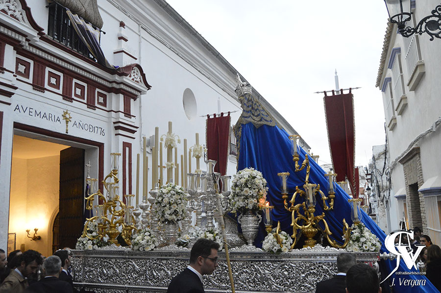 Aunque la salida estaba prevista para las 17:00 horas desde la Iglesia Parroquial de Santa María del Alcor, ante las malas previsiones meteorológicas el cortejo se puso en la calle unos minutos antes de la hora anunciada. Un amplio cortejo antecedía al paso de María Santísima de la Paz, que fue montado de manera excepcional para la ocasión sin los varales ni el palio, siendo iluminado principalmente por los candelabros de guardabrisa del paso de misterio de la Hermandad, teniendo una parte de la candelería del palio, cuyas marías eran rizadas. De esta forma, el paso resultó como un paso de una virgen gloriosa, para un acontecimiento que, sin duda, quedará grabado en oro en los anales de la corporación del Domingo de Ramos.