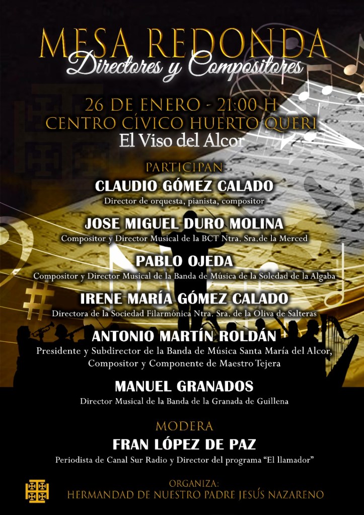 Con la llegada de la Cuaresma cada vez más cerca, a tan solo unas semanas del Miércoles de Ceniza, la Hermandad de Jesús Nazareno organiza una Mesa Redonda de Directores y Compositores. En ella se reunirán participantes relacionados con el mundo de la música procesional.