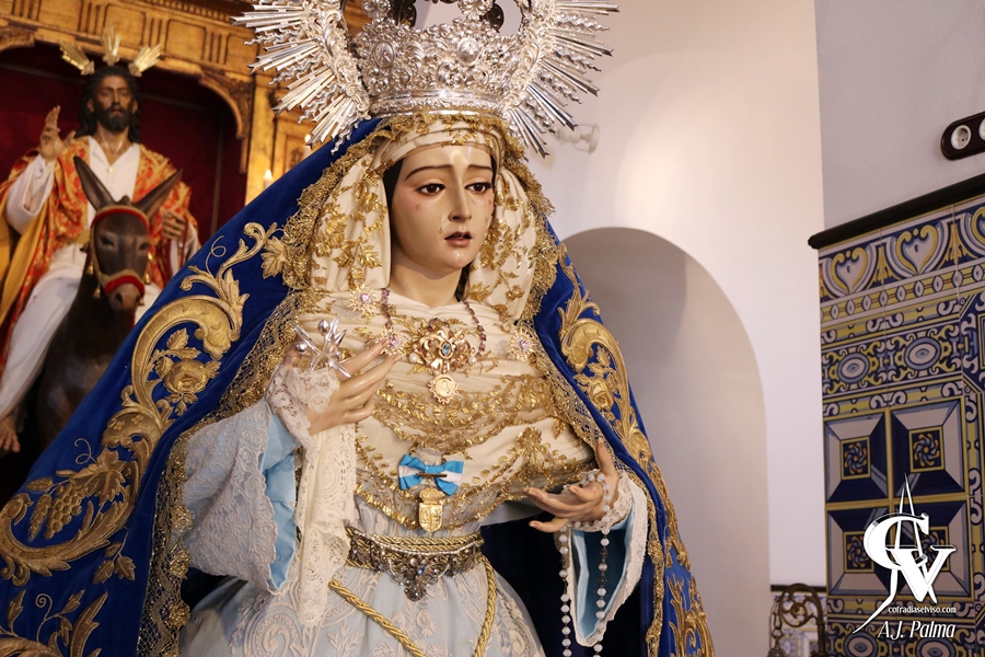 Por su parte, la Virgen de la Paz lucía saya celeste, manto de terciopelo azul pavo con vistas bordadas. Entre las múltiples joyas y broches que portaba la Santísima Virgen, destacaban una rama de olivo de plata en la mano derecha de la Virgen, referenciando a su advocación, y la Medalla de Oro de la Villa, que le fue impuesta el pasado 4 de noviembre de 2023 por el Alcalde de El Viso del Alcor. Dos faroles pertenecientes a su paso de palio flanqueaban a la Sagrada Imagen.