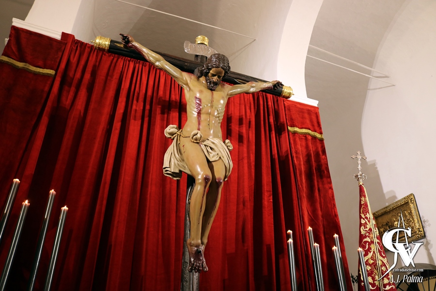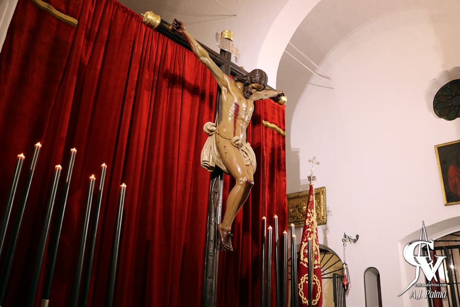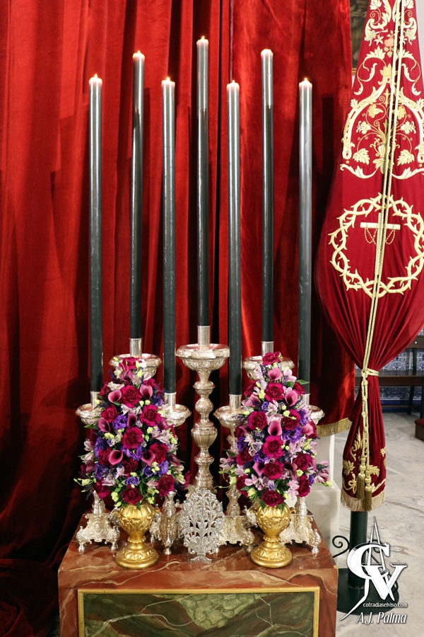 A ambos lados del Santísimo Cristo de la Vera-Cruz se encontraban plataformas de madera marmoleadas, sobre las que se colocaron siete puntos de luz a cada lado, de forma simétrica, con candelabros procedentes del paso de palio de esta cofradía y con cera de color verde oscuro, como referencia a la advocación de este Sagrado Titular. Además, dos jarras de madera doradas con flores variadas y un mariposero completaban cada plataforma.