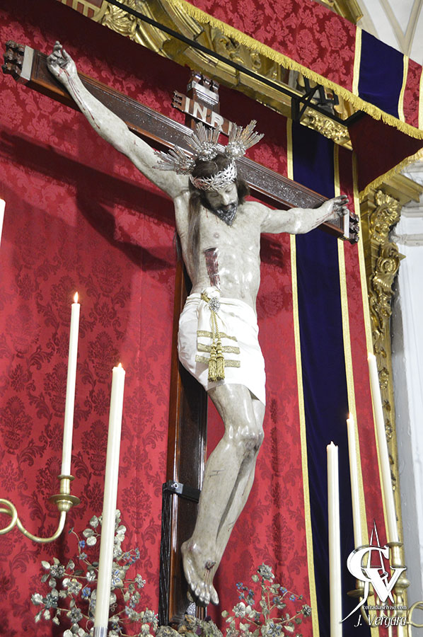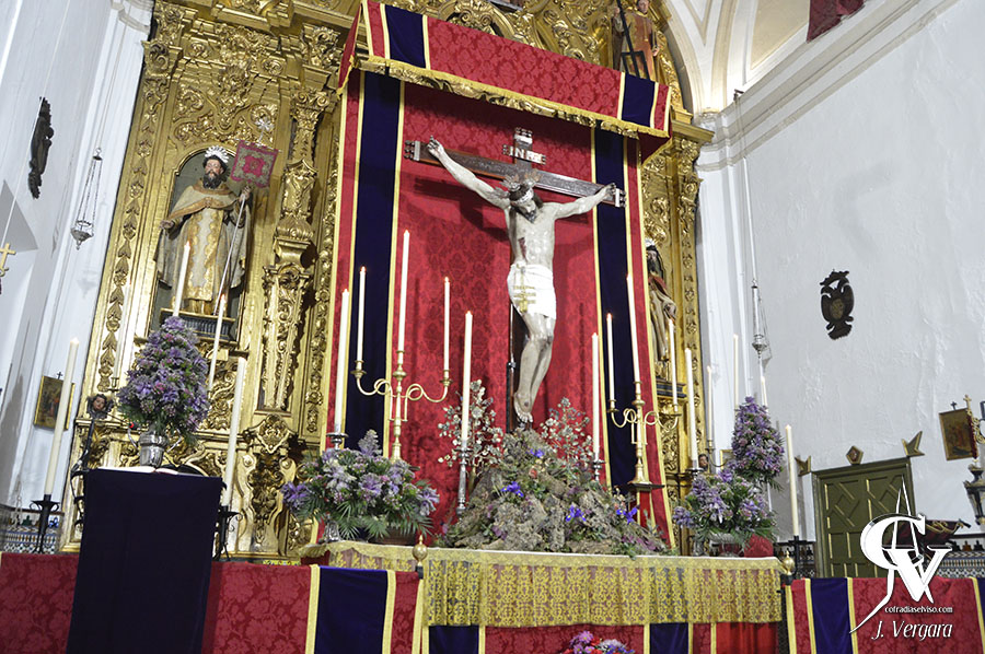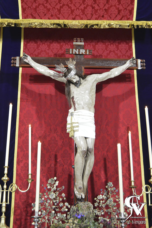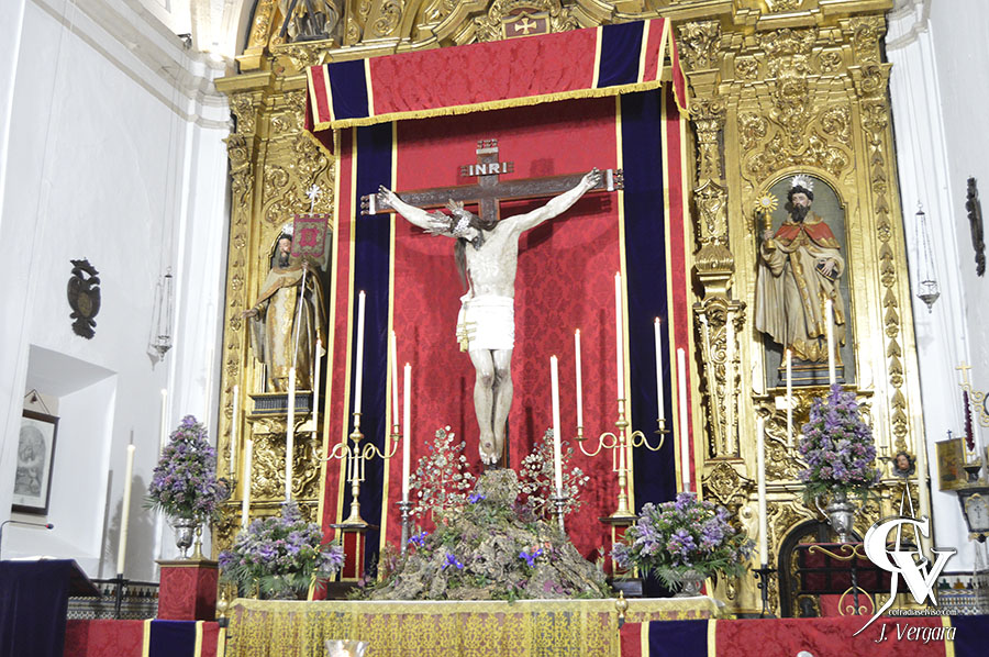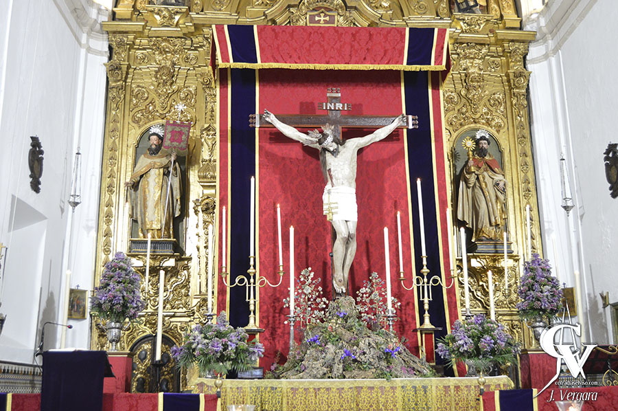 Para la ocasión, se realizó un altar temporal que presenta cambios respecto al montado en años anteriores. Se mantiene el mismo dosel y la misma candelería, de cera blanca, aunque se ha optado por recrear un monte con flores silvestres y plantas herbáceas salpicadas, que simula con naturalidad el Calvario, y sobre este está clavado en posición vertical el Cristo de la Misericordia, que lleva potencias y corona de espinas de plata, y sudario liso.