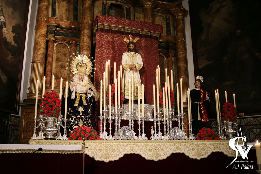 Para la celebración de estos cultos, la priostía de la corporación del Miércoles Santo montó un altar efímero siguiendo el plan de altar de años anteriores, con las Sagradas Imágenes de la Hermandad dispuestas en dos alturas distintas. Así, a los Sagrados Titulares se les unía San Juan Evangelista, la imagen tallada por el escultor-imaginero visueño D. Ramón Martín hace unos años, con una distribución similar a la que tienen en el retablo en el que reciben culto diario durante todo el año.