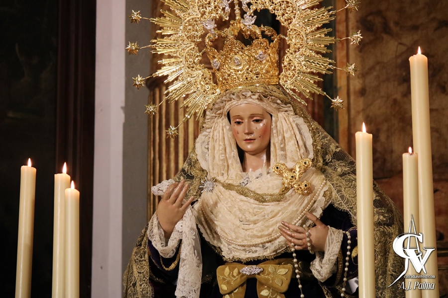 A lo largo del altar se encontraron distintos ramos de flores, tanto en jarras de plata procedentes del paso de palio como en ramos colocados a los pies de las Sagradas Imágenes, compuestos por claveles rojos con algo de verde. Además, los puntos de luz se colocaron de forma simétrica, formando cuatro pirámides con sus alturas, utilizando cera blanca y candelabros del paso de palio. En la parte central, además, había piezas de platería y una pequeña imagen de plata de la Inmaculada Concepción, advocación que también posee la Virgen de la Amargura.