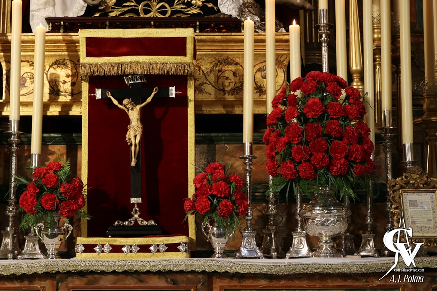 En los distintos niveles de las gradas del altar, siendo estas marmoleadas como el frontal del mismo, se colocaron puntos de luz utilizando candelabros de madera dorada con otros candelabros de plata, portando todos cera de color blanca. Entre los candelabros se colocaron credenciales y jarras de flores, cuyos ramos estaban formados por claveles rojos y algo de verde. Además, en la parte central se encontraba un crucifijo con cruz de caoba y casquillos e INRI de plata, estando este crucifijo colocado en un manifestador de terciopelo rojo con galones y apliques de plata.