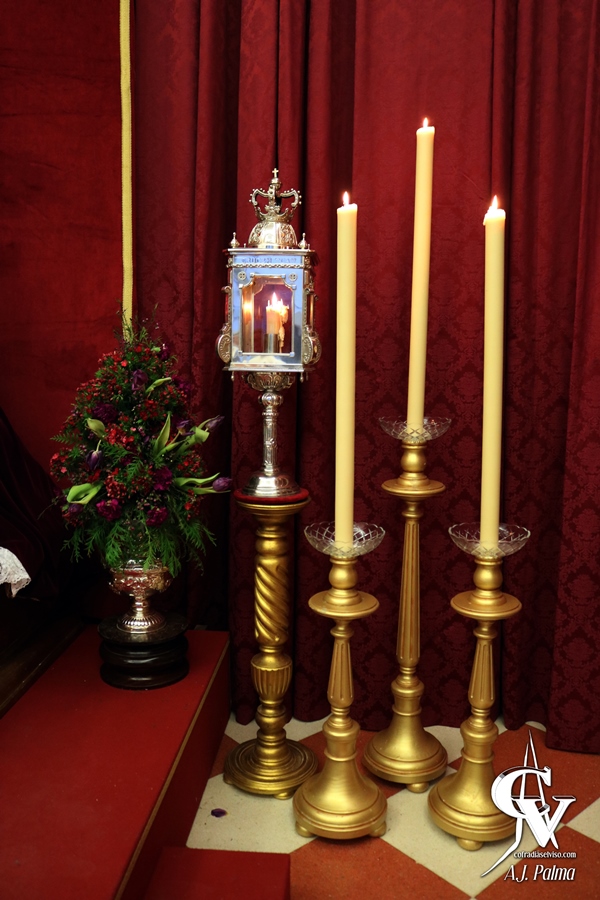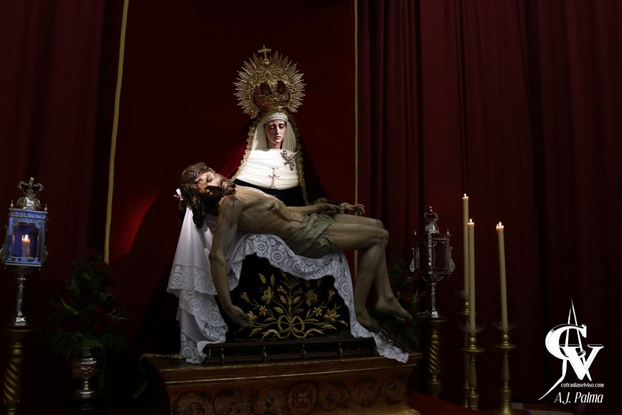 Allí, el Sagrado Misterio recibió durante tres días a los fieles y devotos en besamanos, en un ambiente de recogimiento propio de esta Hermandad. Así, los Sagrados Titulares se encontraban sobre una peana dorada con motivos vegetales pintados, luciendo Nuestra Señora de la Piedad saya de terciopelo azul bordada en oro fino y manto de terciopelo burdeos, con un tocado a tablas en el que se portaba una cruz pectoral y un puñal.