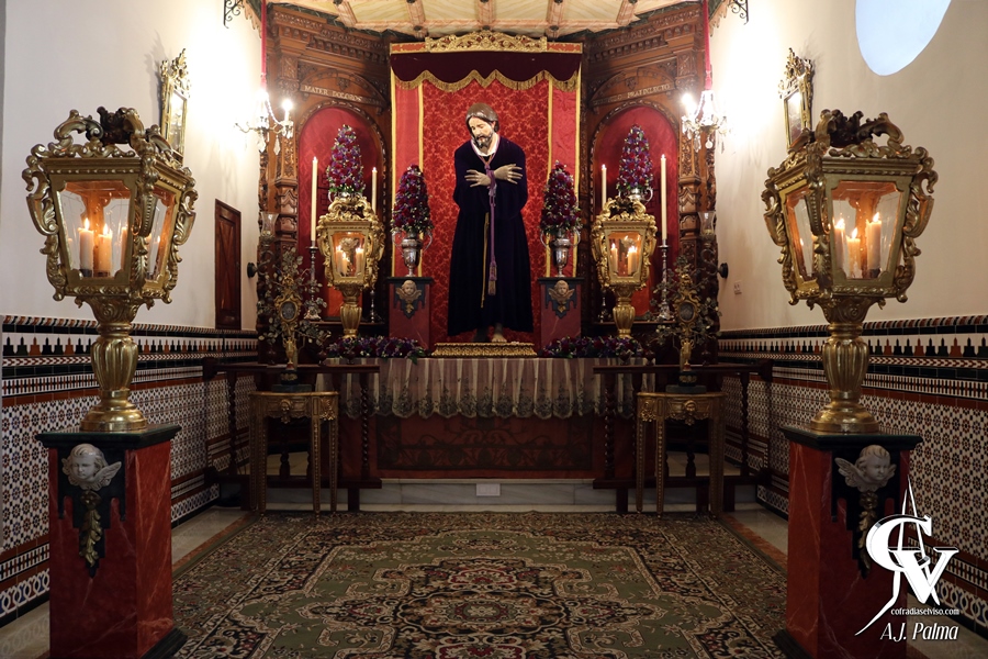 La Sagrada Imagen estaba cobijada por un dosel de damasco rojo rematado por una bambalina de terciopelo burdeos. A ambos lados del Señor se podían ver tanto faroles de su antiguo paso procesional como pedestales marmoleados con cabezas de ángeles, sobre los que se colocaron jarras con ramos de flores en tonos variados, entre las que destacaban claveles de color rojo sangre. Al igual que en estas jarras, a los pies de los faroles se podían observar ramos con los mismos tipos de flores.