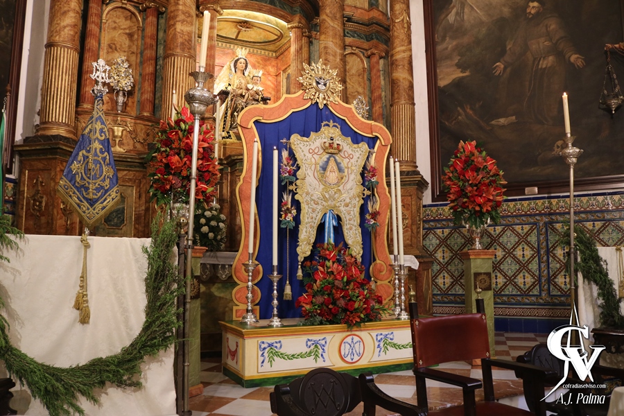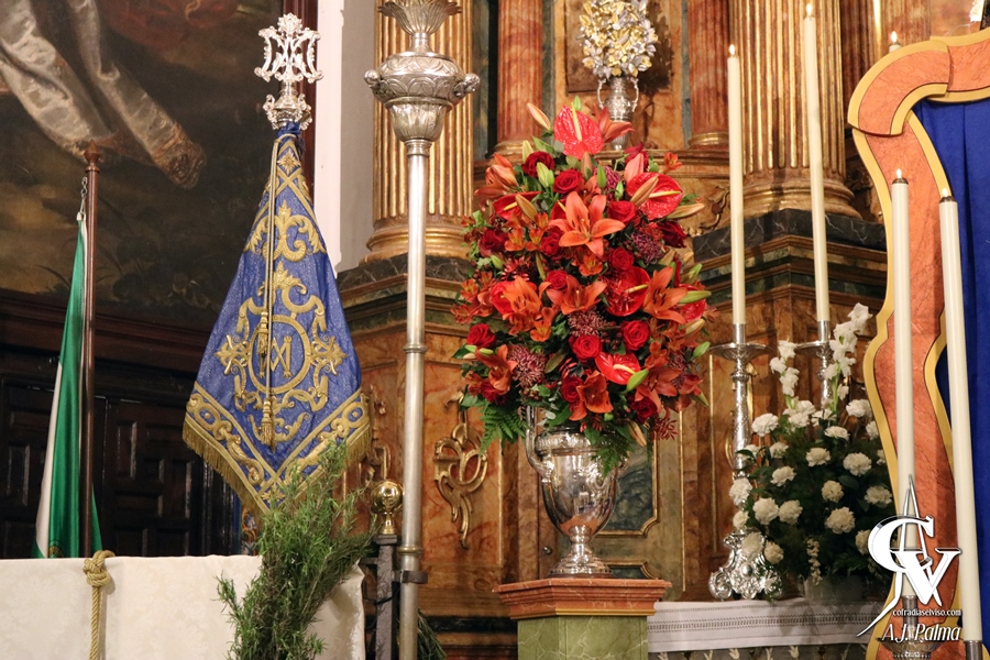 En este altar efímero, el Simpecado de la Filial nº 121 se mostraba enmarcado en su característico dosel, con un marco marmoleado y rematado por el Espíritu Santo. Este año se ha usado un damasco azul con el que se ha destacado todavía más el Simpecado, debido al gran contraste entre el Simpecado y este fondo. Además, esta combinación recordaba a la presencia del Simpecado en su carreta en la Romería del Rocío, al tener un color similar al del techo de la carreta, siendo éste un sello de identidad de la misma.